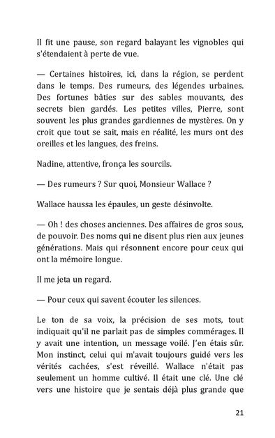 Dans la paisible ville de Bex, en Suisse, la vie de Pierre, journaliste désabusé, est une routine sans éclat. Mais la rencontre avec Monsieur Wallace, son nouveau voisin à l'élégance énigmatique, réveille en lui une curiosité oubliée. Lorsque des secrets enfouis depuis des années refont surface, Pierre se lance dans une enquête qui le mène au cœur d'une affaire de corruption à Montreux, et sur la trace d'un meurtre qui n'a jamais été élucidé. Alors qu'il se rapproche dangereusement de la vérité, Pierre découvre que les apparences sont trompeuses et que les liens qui unissent les habitants de cette région sont bien plus complexes et dangereux qu'il n'y paraît. Entre manipulations, trahisons et mensonges, sa quête de vérité le forcera à faire des choix qui mettront en péril non seulement sa vie, mais aussi celle de ses proches.
